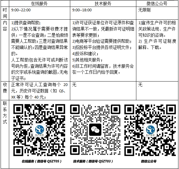 服務(wù)范圍 :提供查詢幫助和驗證、許可證查詢異常處理、宣傳生產(chǎn)許可的相關(guān)政策法規(guī)、生產(chǎn)許可知識的咨詢。為減輕人工服務(wù)工作量,建議自助查詢;查詢時請參考查詢格式(幫助)